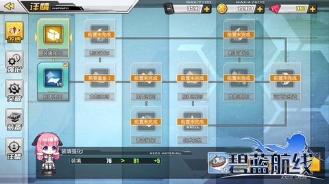 3. 在船坞内,查看可改造舰娘的属性页面,进入改造系统,你会看到多种属性可以强化,需满足等级和星级的条件,并消耗【改造图纸】和物资。