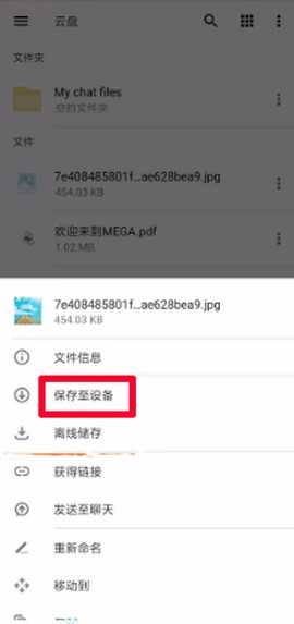 下载自己存储在云盘中的文件,只需长按文件,在弹出的选项中选择【保存至设备】即可。