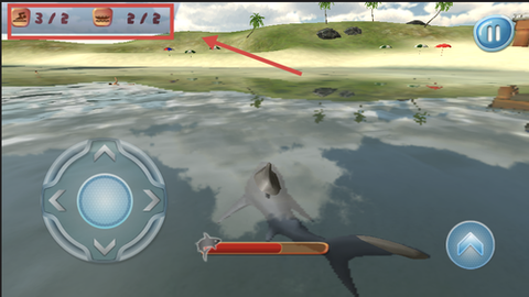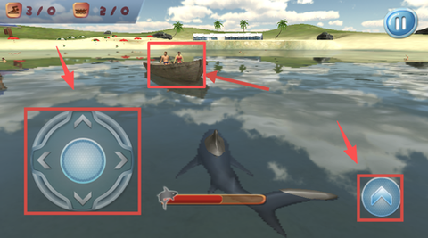 2、使用左侧的虚拟摇杆,你可以自由控制鲨鱼的移动方向,右侧的加速按钮则让你迅速向目标冲刺,靠近前方的船只或猎物,抓住每一次机会。