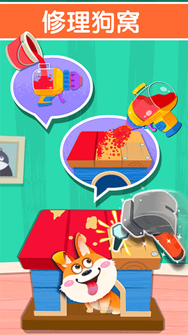 小狗的房子坏掉了,快来帮助它修好屋顶,刷上亮丽的油漆,让小狗开心不已!同时还可以清理掉旧墙纸,贴上粉嫩的新墙纸,整个家瞬间变得温馨可人,孩子们在这里激发了创造力!
