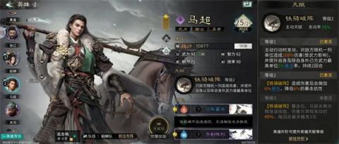 马超的天赋技能【铁骑破阵】可以对敌方一列单位造成伤害,并在两回合的时间内提升他自己和队伍中武力最高单位的5%暴击几率。